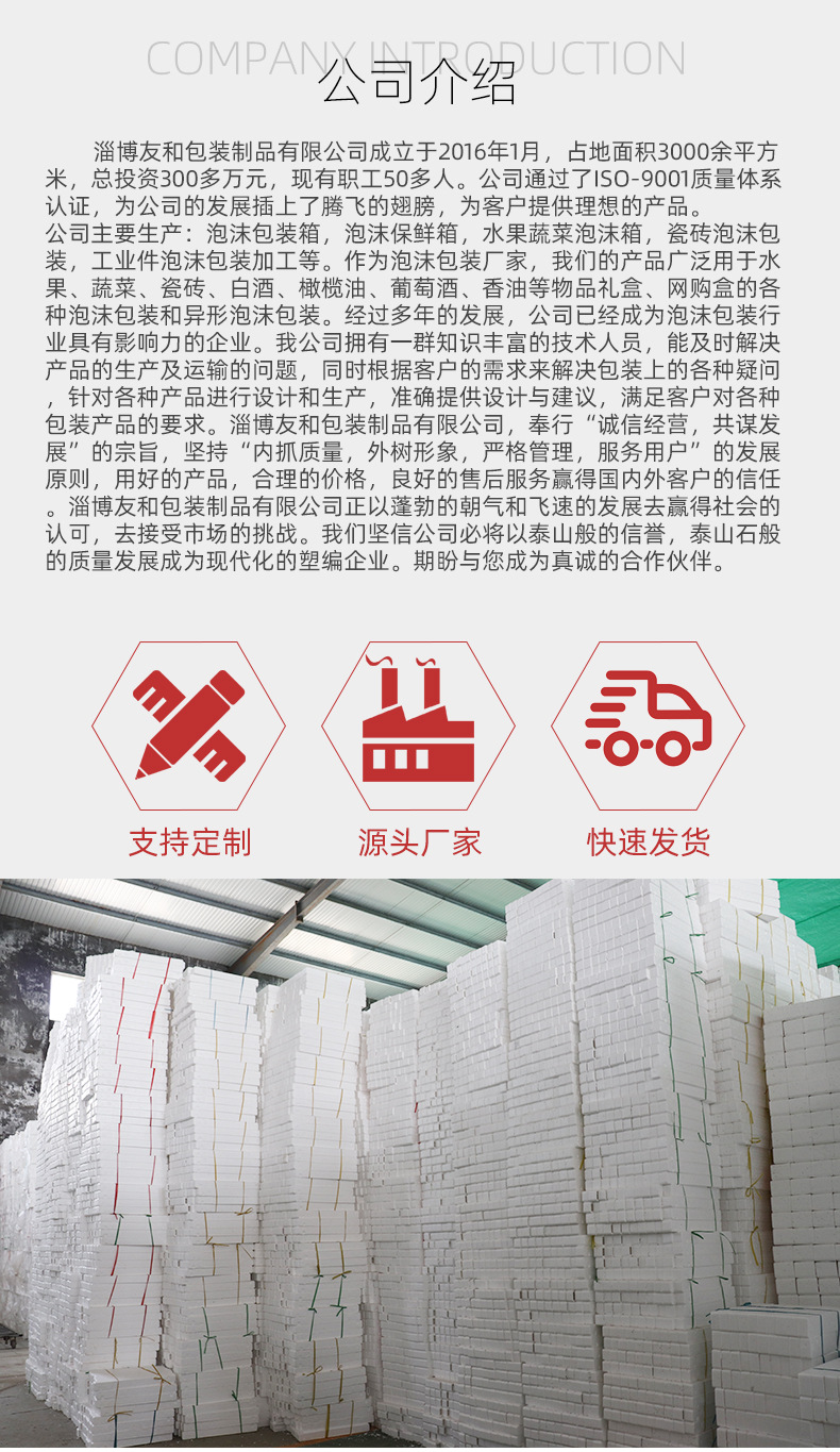 介紹參數圖冊 ????淄博友和包裝制品有限公司是專業的山東泡沫包裝箱加工廠家,本廠主要產品有:泡沫包裝箱,泡沫保鮮箱,水果蔬菜泡沫包裝箱,水果蔬菜泡沫保鮮箱,瓷磚泡沫包裝箱等,產品暢銷全國,深受用戶好評。泡沫包裝定做可以聯系我們網站 http://m.jmao.com.cn/ 上電話,我們會第一時間跟您聯系。 上一篇沒有了! 下一篇電瓶泡沫包裝箱